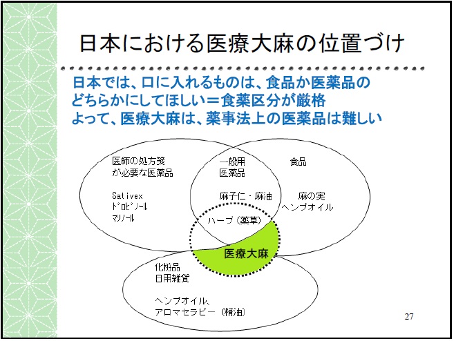 → 日本には、大麻取締法の壁もあるけれど、改正しても薬事法の壁があります。